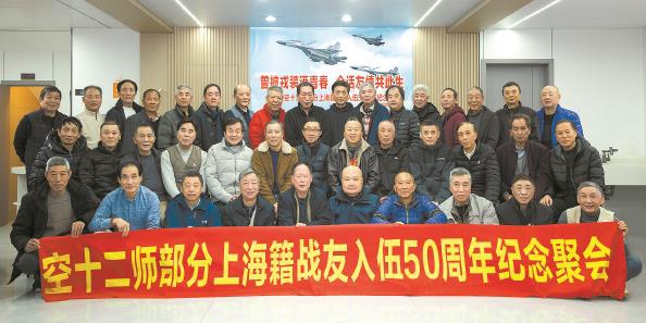 翌日晚餐前全体合影,像当年那样,宋连长点名:陈春郎、顾寿诞……40名退役老兵站在古建筑前,前排战友拉着横幅,上书:原航空十二师部分上海籍战友入伍50周年纪念聚会。快门咔嚓一声,将这一刻永远地定格。