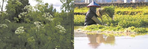 奚耀举例说,毒芹和水芹,均是伞形科植物,叶片羽状分裂,外形极像,常生长在水边。毒芹茎上有紫色斑点,水芹茎光滑翠绿;闻上去水芹有芹菜清香味,毒芹则有恶臭(鼠尿味)。误食毒芹可引发强烈抽搐、呼吸衰竭。