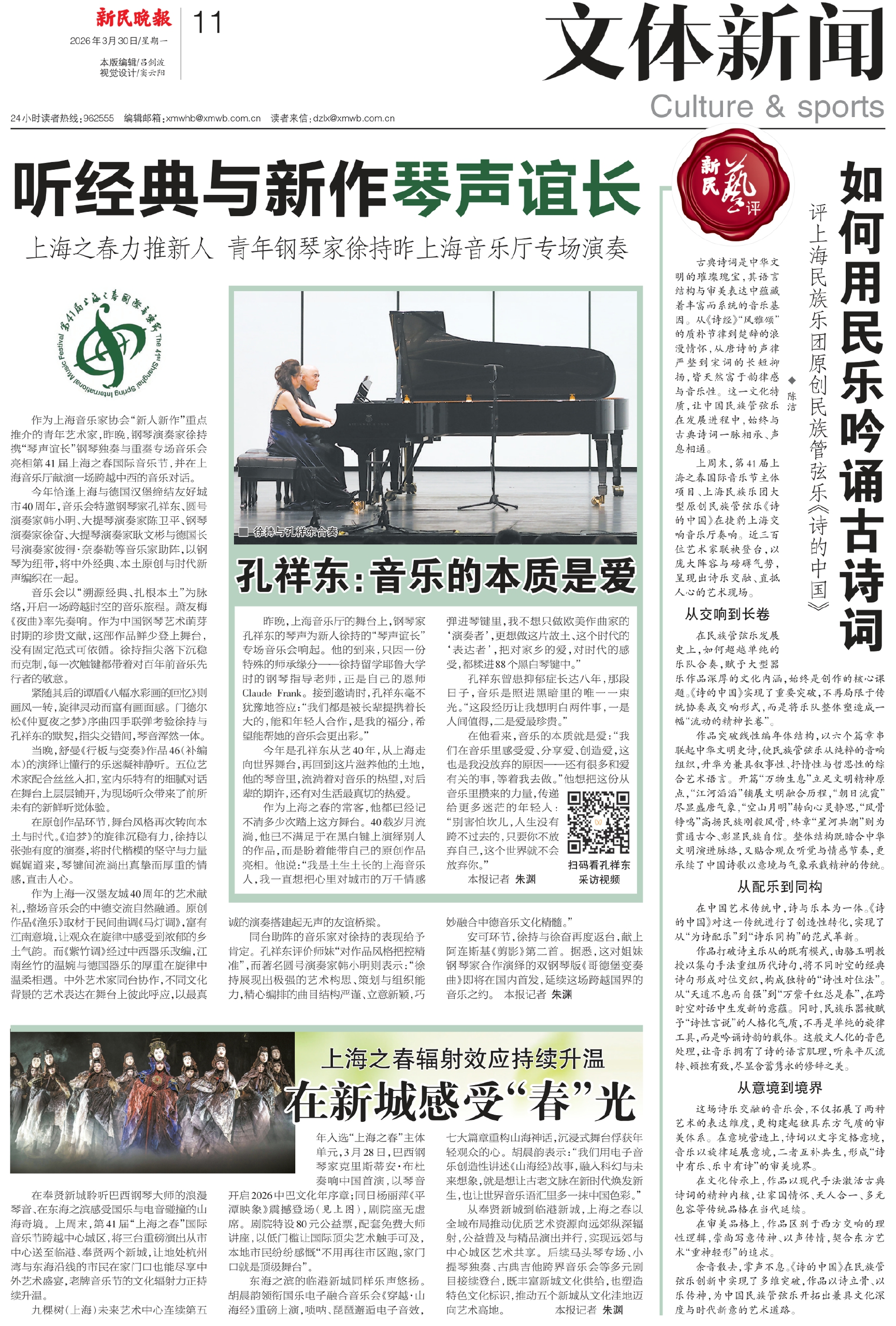 作为上海音乐家协会“新人新作”重点推介的青年艺术家,昨晚,钢琴演奏家徐持携“琴声谊长”钢琴独奏与重奏专场音乐会亮相第41届上海之春国际音乐节,并在上海音乐厅献演一场跨越中西的音乐对话。