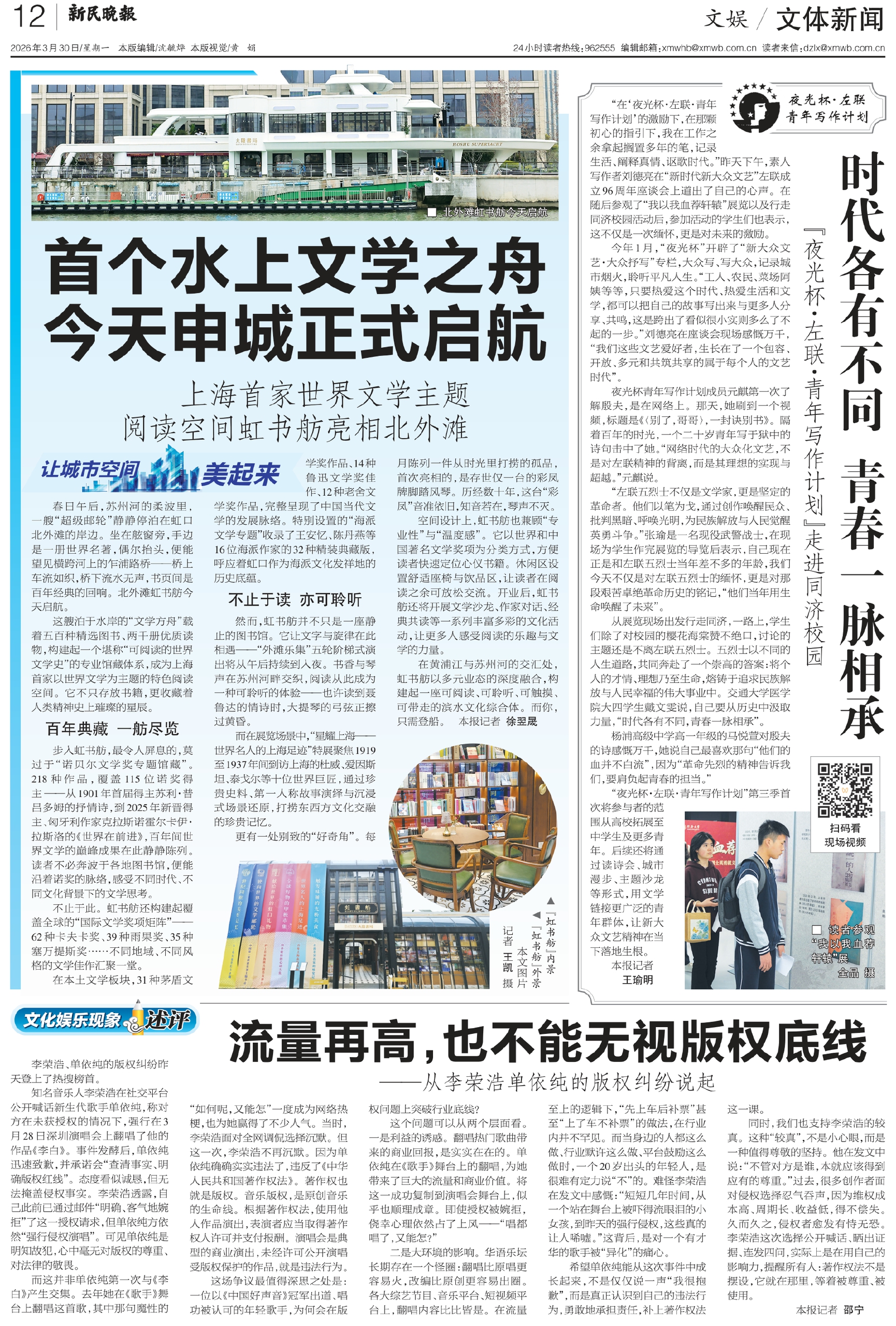 春日午后,苏州河的柔波里,一艘“超级邮轮”静静停泊在虹口北外滩的岸边。坐在舷窗旁,手边是一册世界名著,偶尔抬头,便能望见横跨河上的乍浦路桥——桥上车流如织,桥下流水无声,书页间是百年经典的回响。北外滩虹书舫今天启航。
