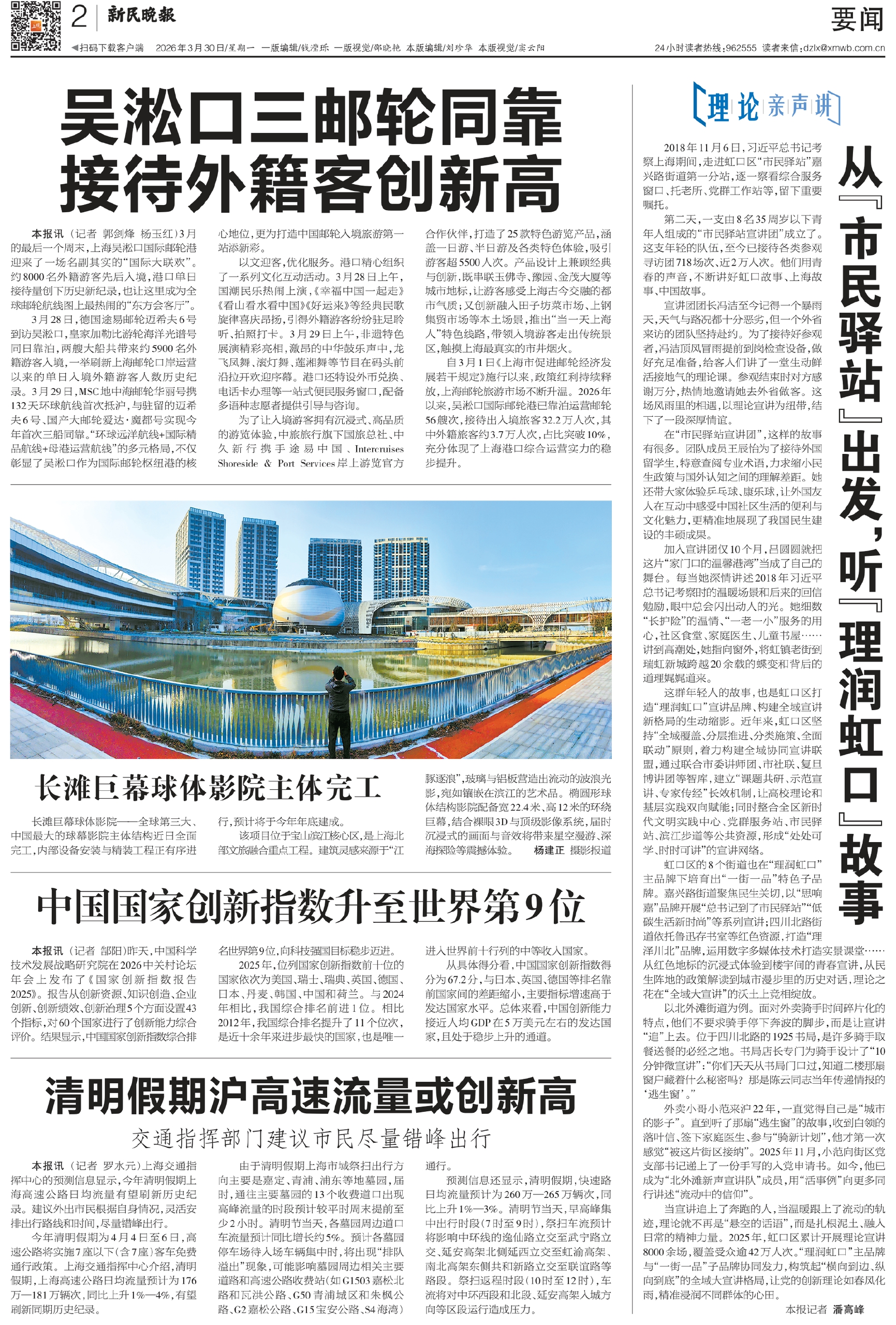 自3月1日《上海市促进邮轮经济发展若干规定》施行以来,政策红利持续释放,上海邮轮旅游市场不断升温。2026年以来,吴淞口国际邮轮港已靠泊运营邮轮56艘次,接待出入境旅客32.2万人次,其中外籍旅客约3.7万人次,占比突破10%,充分体现了上海港口综合运营实力的稳步提升。