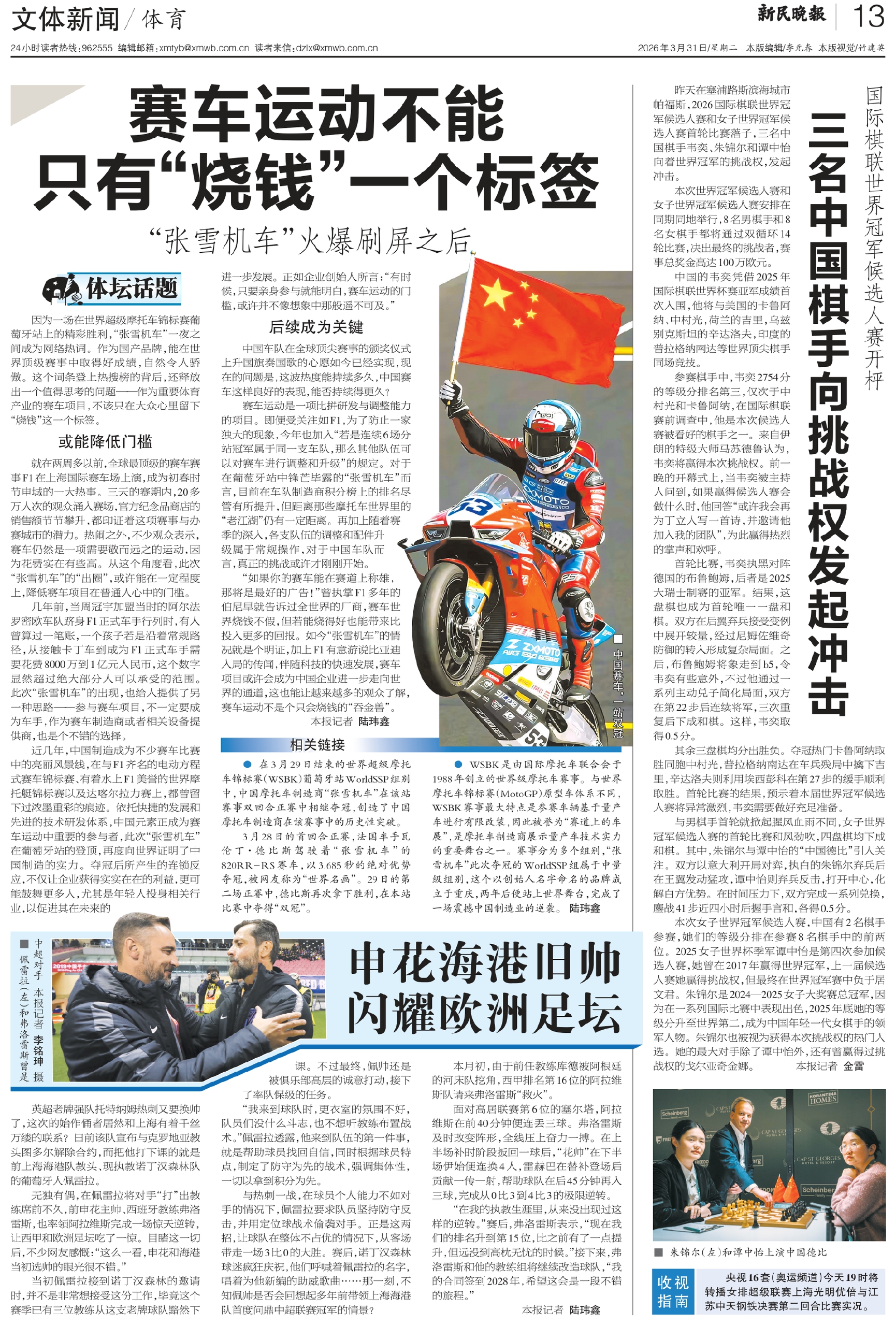 因为一场在世界超级摩托车锦标赛葡萄牙站上的精彩胜利,“张雪机车”一夜之间成为网络热词。作为国产品牌,能在世界顶级赛事中取得好成绩,自然令人骄傲。这个词条登上热搜榜的背后,还释放出一个值得思考的问题——作为重要体育产业的赛车项目,不该只在大众心里留下“烧钱”这一个标签。
