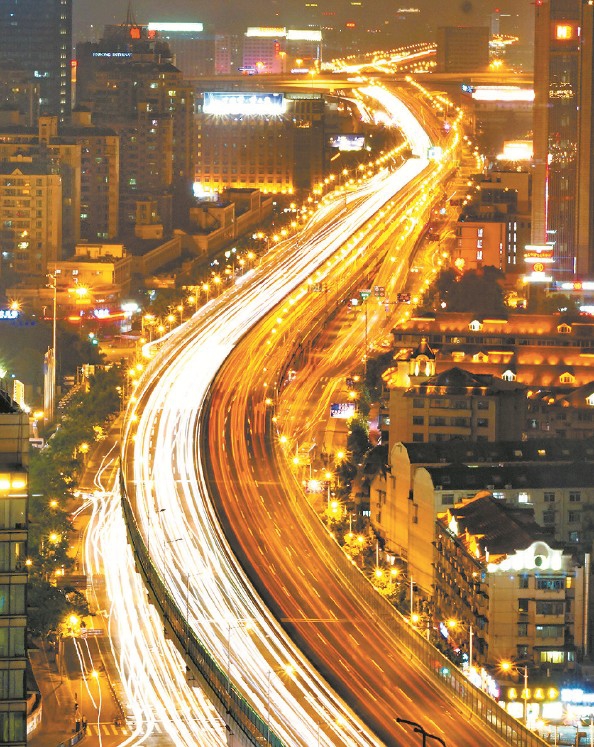 起初,晚高峰的拥堵让车流走走停停,几次按下快门,得到的都是断断续续的光斑,如同乐章里错杂的断音。正当我准备收起器材时,拥堵竟悄然消散,车辆如挣脱羁绊的音符,在高架上流畅奔涌。我立刻调整参数,光圈值:F20,焦距:50mm,以15秒长曝光定格。