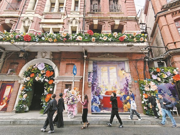这几天,申城外滩源周边的建筑被缤纷花束包围,给市民、游客带来春天的惊喜。五彩缤纷的花束沿着红砖墙老建筑布置,二楼阳台、入口拱门、广告橱窗边、路灯杆上处处是花,处处是景。花艺与老建筑融为一体,随手一拍就很“出片”。