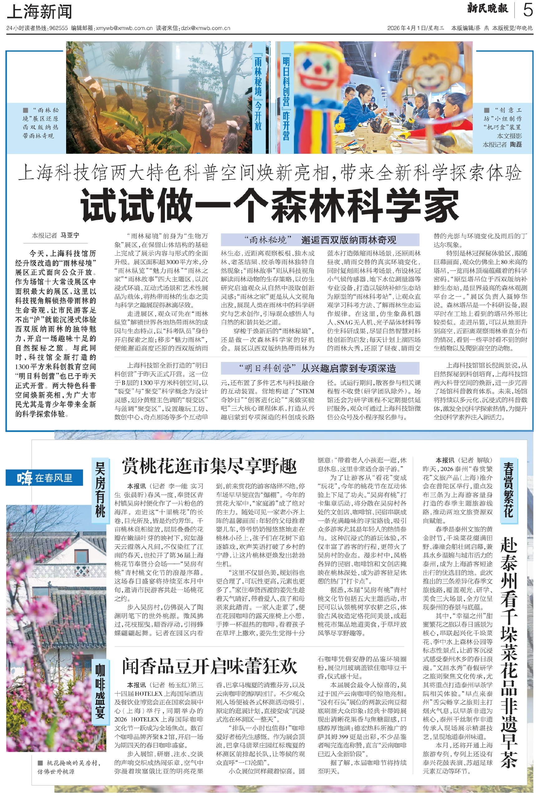 今天,上海科技馆历经升级改造的“雨林秘境”展区正式面向公众开放。作为场馆十大常设展区中面积最大的展区,这里以科技视角解锁热带雨林的生命奇观,让市民游客足不出“沪”就能沉浸式体验西双版纳雨林的独特魅力,开启一场趣味十足的自然探秘之旅。与此同时,科技馆全新打造的1300平方米科创教育空间“明日科创营”也已于昨天正式开营。两大特色科普空间焕新亮相,为广大市民尤其是青少年带来全新的科学探索体验。