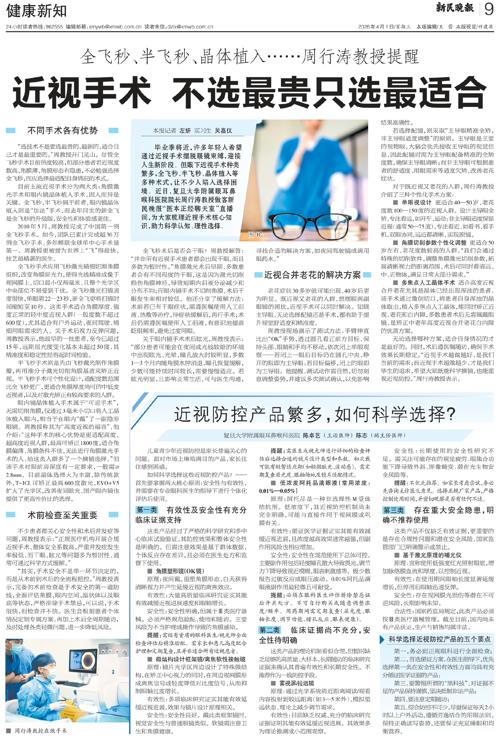 毕业季将近,许多年轻人希望通过近视手术摆脱眼镜束缚,迎接人生新阶段。但眼下近视手术种类繁多,全飞秒、半飞秒、晶体植入等多种术式,让不少人陷入选择困境。近日,复旦大学附属眼耳鼻喉科医院院长周行涛教授做客新民晚报“医本正经聊天室”直播间,为大家梳理近视手术核心知识,助力科学认知、理性选择。