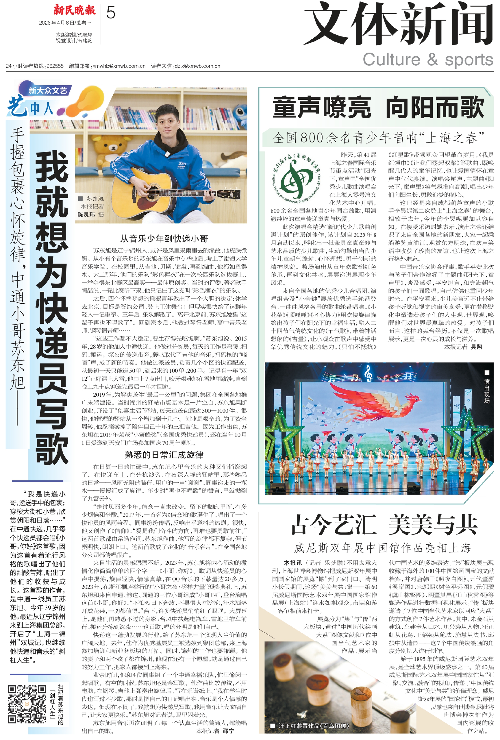 “我是快递小哥,递送手中的包裹;穿梭大街和小巷,欣赏朝阳和日落……”在中通快递,几乎每个快递员都会唱《小哥,你好》这首歌,因为这首有着流行风格的歌唱出了他们的甜酸苦辣,唱出了他们的收获与成长。这首歌的作者,是中通一线员工苏东旭。今年39岁的他,最近从辽宁锦州来到上海集团总部,开启了“上海—锦州”双城记,也继续他快递和音乐的“斜杠人生”。