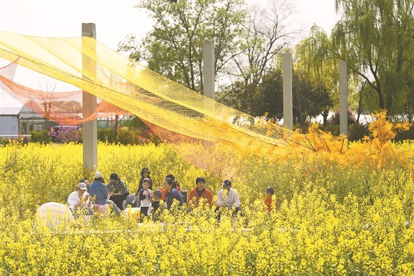 嗨在春风里 嘉定春日油菜花艺术节在嘉源海美术馆举办,图为游客们在花油菜田里赏花 本报记者 徐程 摄