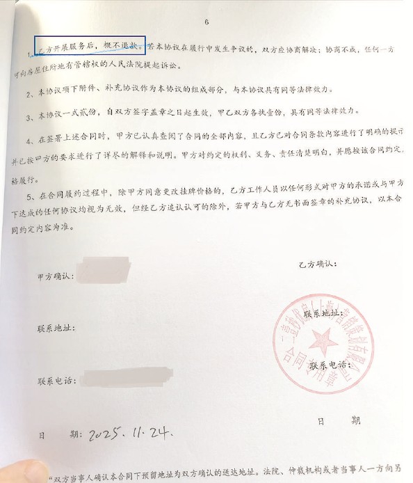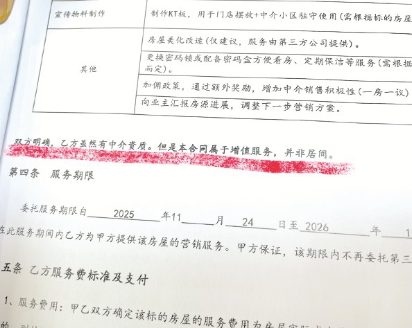 可没想到,今年3月中旬,“秒优房”突然发消息告知李老伯,服务停止。他再次提出退款,对方却以“合同有约定”为由,拒绝退还任何费用。记者查看双方签订的《二手房营销服务合同》发现,其中明确写有“一旦开展服务,概不退款”的条款,同时专门声明,本合同属于卖房增值服务,“并非居间”。