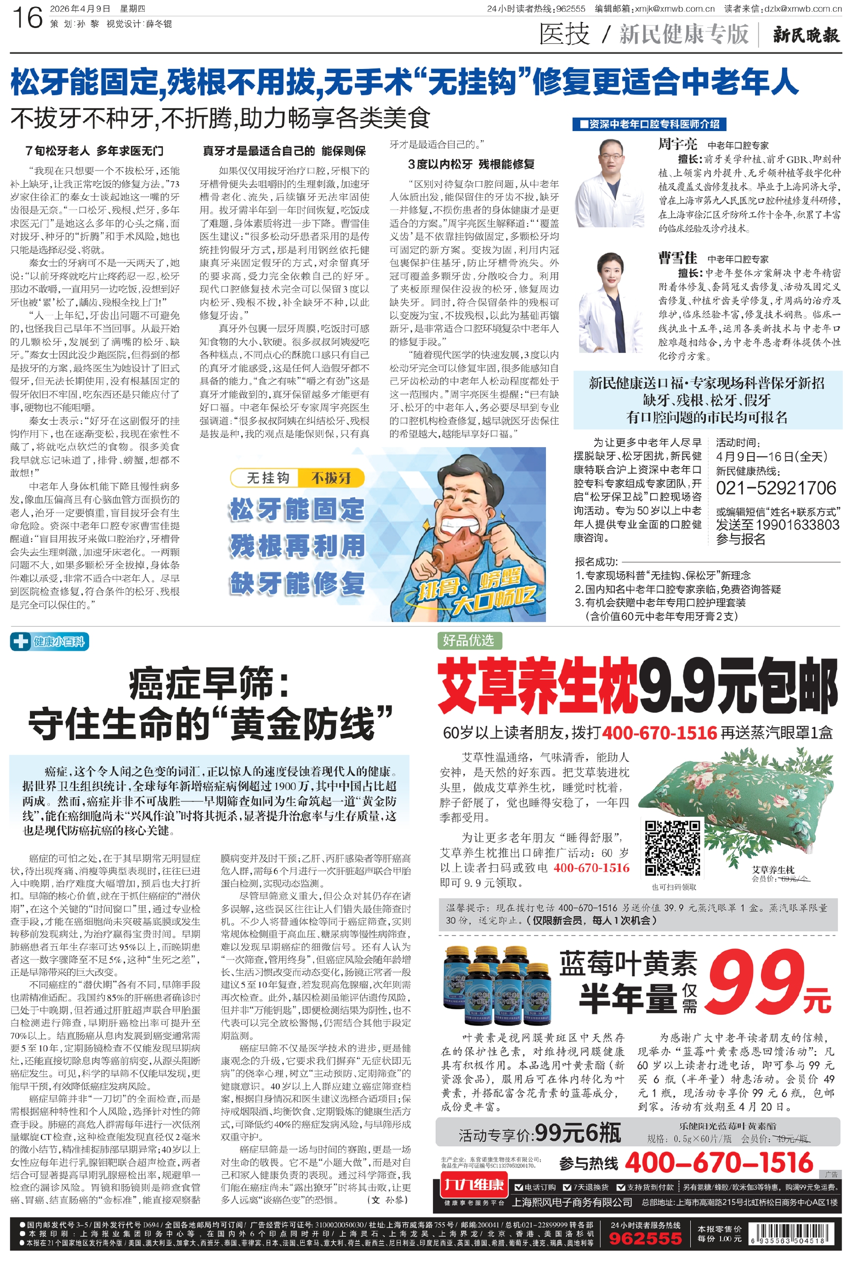 为让更多中老年人尽早摆脱缺牙、松牙困扰,新民健康特联合沪上资深中老年口腔专科专家组成专家团队,开启“松牙保卫战”口腔现场咨询活动。专为50岁以上中老年人提供专业全面的口腔健康咨询。