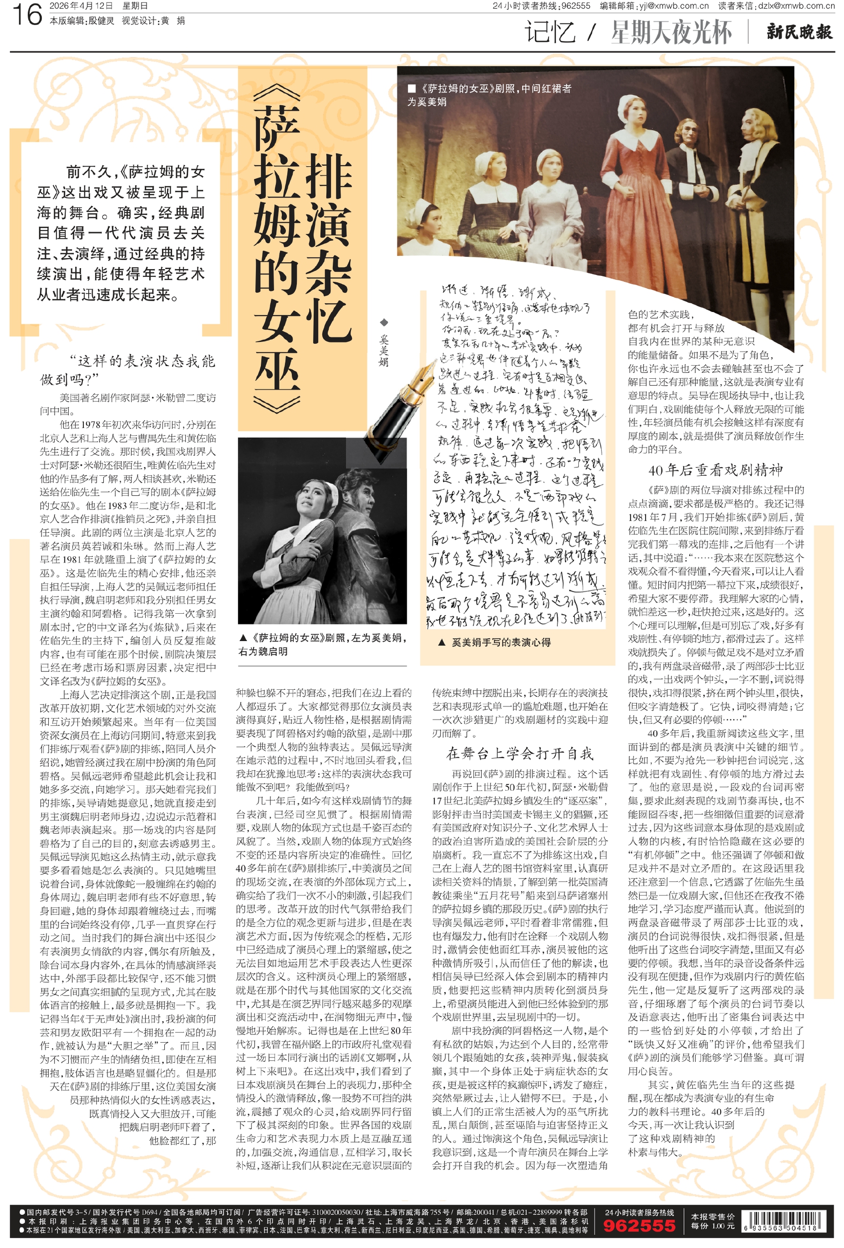 他在1978年初次来华访问时,分别在北京人艺和上海人艺与曹禺先生和黄佐临先生进行了交流。那时候,我国戏剧界人士对阿瑟·米勒还很陌生,唯黄佐临先生对他的作品多有了解,两人相谈甚欢,米勒还送给佐临先生一个自己写的剧本《萨拉姆的女巫》。他在1983年二度访华,是和北京人艺合作排演《推销员之死》,并亲自担任导演。此剧的两位主演是北京人艺的著名演员英若诚和朱琳。然而上海人艺早在1981年就隆重上演了《萨拉姆的女巫》。这是佐临先生的精心安排,他还亲自担任导演,上海人艺的吴佩远老师担任执行导演,魏启明老师和我分别担任男女主演约翰和阿碧格。记得我第一次拿到剧本时,它的中文译名为《炼狱》,后来在佐临先生的主持下,编创人员反复推敲内容,也有可能在那个时候,剧院决策层已经在考虑市场和票房因素,决定把中文译名改为《萨拉姆的女巫》。