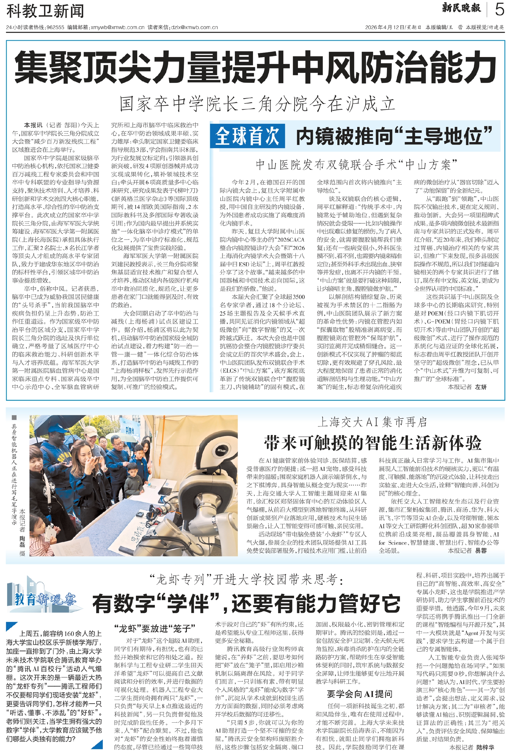 卒中,俗称中风。记者获悉,脑卒中已成为威胁我国居民健康的“头号杀手”,当前我国脑卒中疾病负担仍呈上升态势,防治工作任重道远。作为国家级卒中防治平台的区域分支,国家卒中学院长三角分院的选址及执行单位确立,严格考量了区域医疗中心的临床救治能力、科研创新水平与人才培养底蕴。海军军医大学第一附属医院脑血管病中心是国家临床重点专科、国家高级卒中中心示范中心、全军脑血管病研究所和上海市脑卒中临床救治中心,在卒中防治领域成果丰硕、实力雄厚:牵头制定国家卫健委临床指导规范3部、学会指南共识8部,为行业发展立标定向;引领器具创新突破,研发4项原创器械并成功实现成果转化,填补领域技术空白;牵头开展6项高质量多中心临床研究,研究成果发表于《柳叶刀》《新英格兰医学杂志》等国际顶级期刊,被14部欧美国际指南、2本国际教科书及多部国际专著收录引用;作为国内最早提出并系统实施“一体化脑卒中诊疗模式”的单位之一,为卒中诊疗标准化、规范化发展提供了宝贵实践经验。