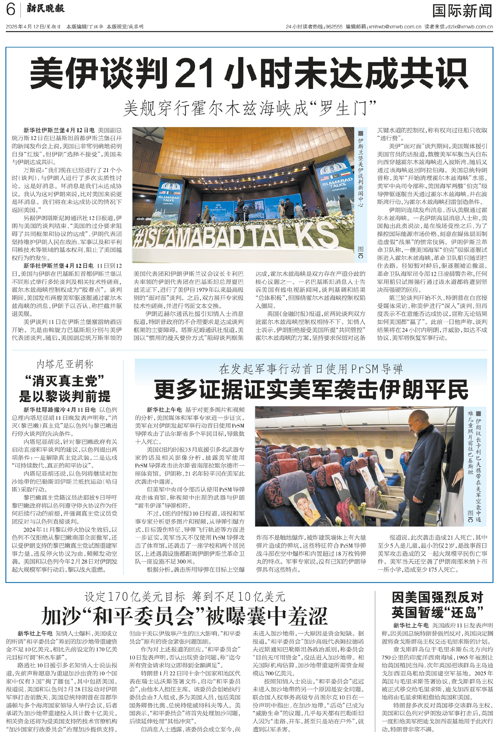新华社伊斯兰堡4月12日电 美国副总统万斯12日在巴基斯坦首都伊斯兰堡召开的新闻发布会上说,美国已非常明确地说明自身“红线”,但伊朗“选择不接受”,美国未与伊朗达成共识。