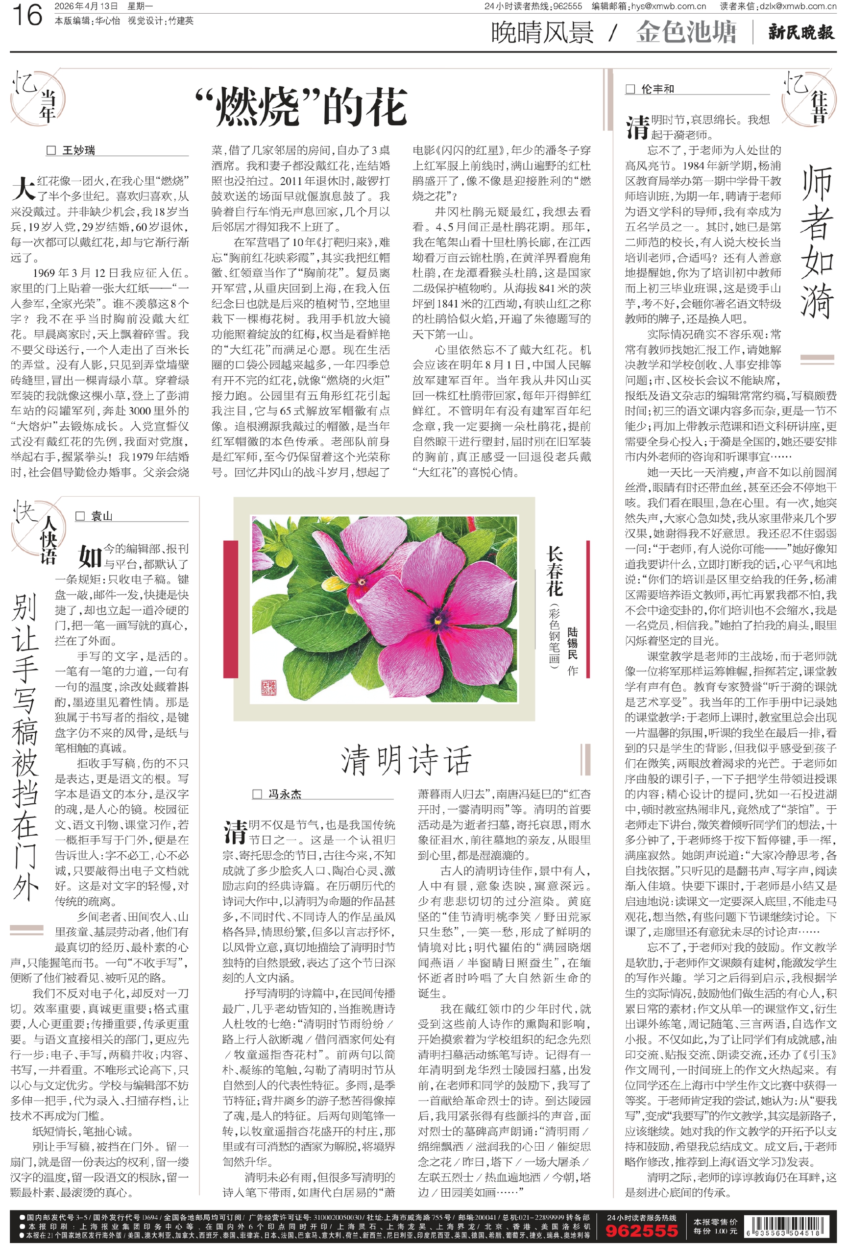 在军营唱了10年《打靶归来》,难忘“胸前红花映彩霞”,其实我把红帽徽、红领章当作了“胸前花”。复员离开军营,从重庆回到上海,在我入伍纪念日也就是后来的植树节,空地里栽下一棵梅花树。我用手机放大镜功能照着绽放的红梅,权当是看鲜艳的“大红花”而满足心愿。现在生活圈的口袋公园越来越多,一年四季总有开不完的红花,就像“燃烧的火炬”接力跑。公园里有五角形红花引起我注目,它与65式解放军帽徽有点像。追根溯源我戴过的帽徽,是当年红军帽徽的本色传承。老部队前身是红军师,至今仍保留着这个光荣称号。回忆井冈山的战斗岁月,想起了电影《闪闪的红星》,年少的潘冬子穿上红军服上前线时,满山遍野的红杜鹃盛开了,像不像是迎接胜利的“燃烧之花”?