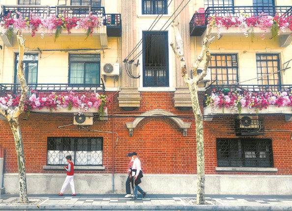 近日,2026上海国际花卉节黄浦城市主会场新天地旁,淡水路衡复历史风貌区的建筑阳台上都布置了缤纷花卉 杨建正 摄