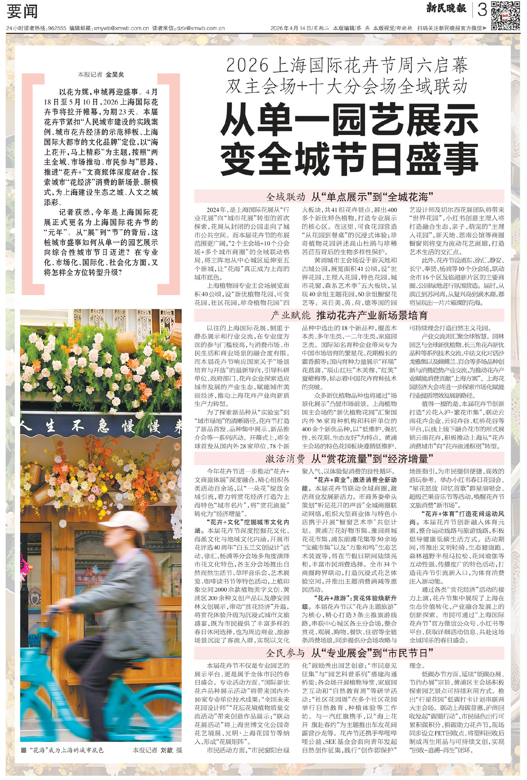 通过各类“赏花经济”活动的接力上演,花卉节集中展现了上海在生态价值转化、产业融合发展上的创新探索。市民可通过“上海国际花卉节”官方微信公众号、小红书等平台,获取详细活动信息,共赴这场全城同乐的春日盛会。