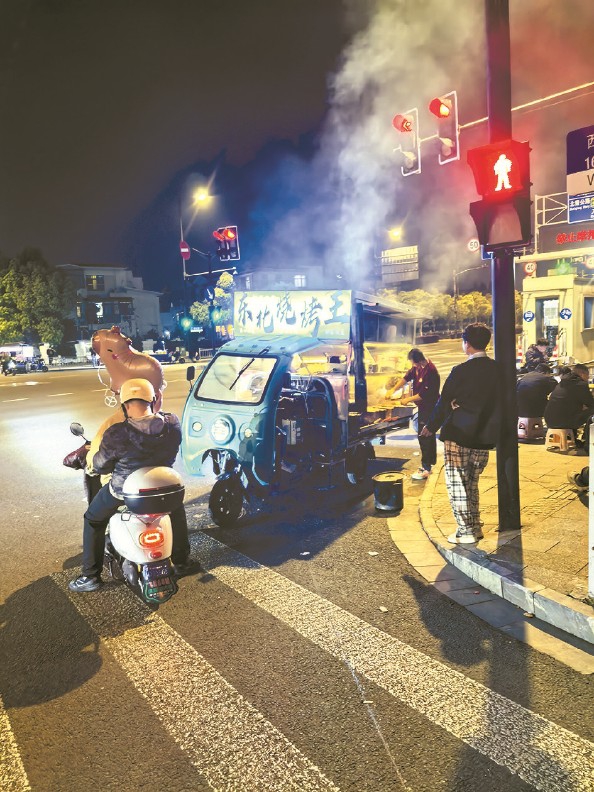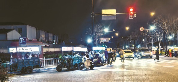 除了油烟四溢、垃圾遍地,小吃摊占道经营还严重影响了道路通行,埋下安全隐患。记者观察发现,由于路口的非机动车道几乎被摊位完全占据,过往的电动自行车、自行车无法正常通行,只能被迫驶入机动车道,与疾驰而过的汽车并行,往来车辆穿梭,场面险象环生。“有次晚上下班,我骑车经过这里,没注意到占道的摊位,差点被绊倒,现在想想都后怕。”一位路过的市民连连摇头,对这种乱象颇有微词。
