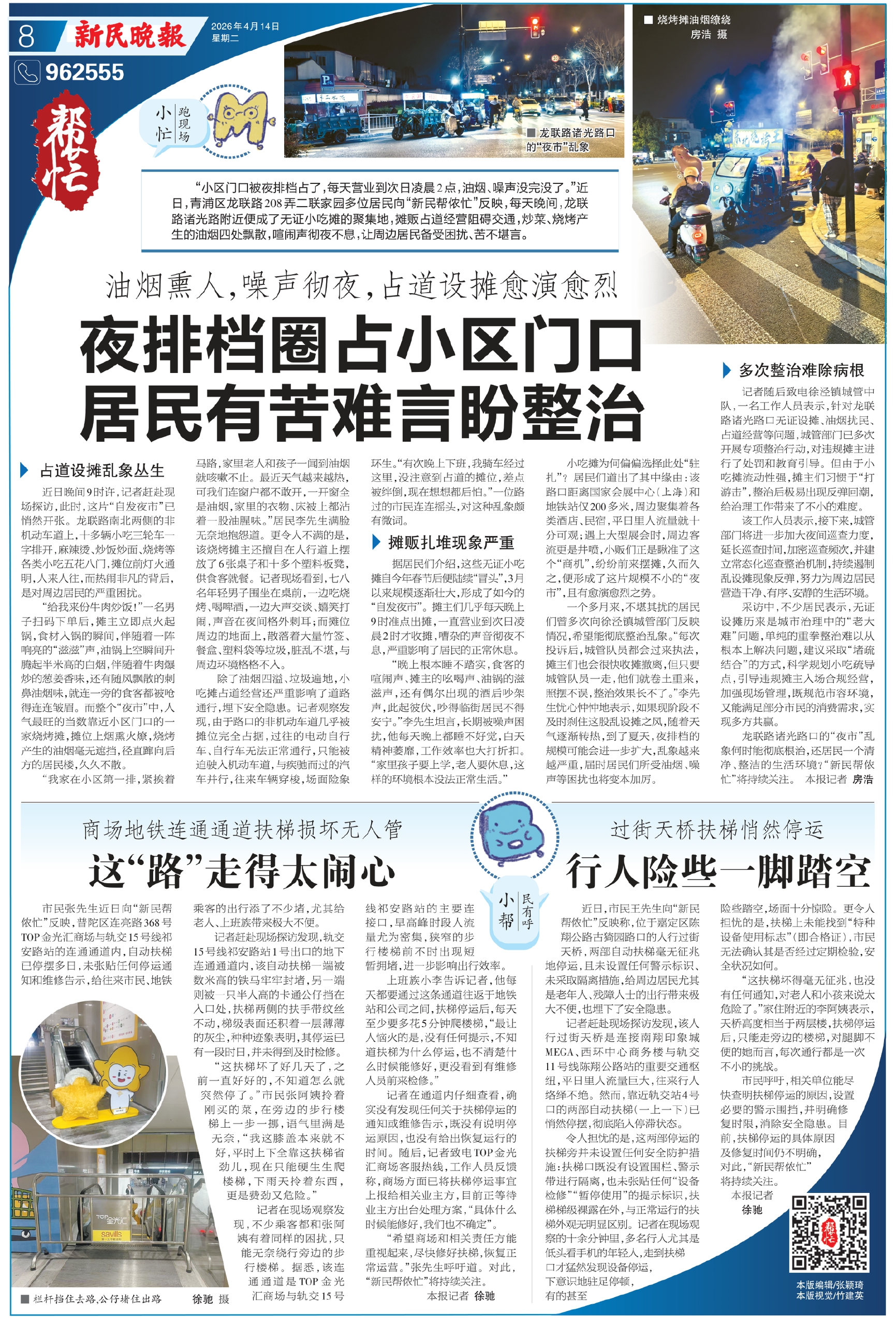 “小区门口被夜排档占了,每天营业到次日凌晨2点,油烟、噪声没完没了。”近日,青浦区龙联路208弄二联家园多位居民向“新民帮侬忙”反映,每天晚间,龙联路诸光路附近便成了无证小吃摊的聚集地,摊贩占道经营阻碍交通,炒菜、烧烤产生的油烟四处飘散,喧闹声彻夜不息,让周边居民备受困扰、苦不堪言。