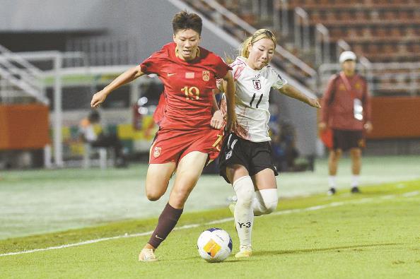 中国队球员曾雨佳(左)与日本队球员拼抢 新华社 发