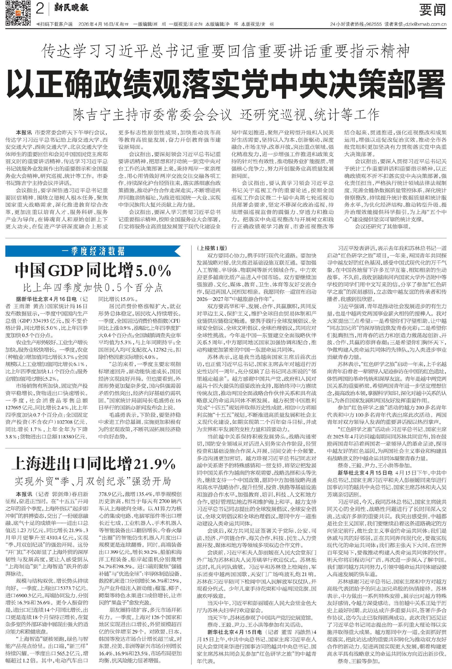 本报讯 市委常委会昨天下午举行会议,传达学习习近平总书记给上海交通大学、西安交通大学、西南交通大学、北京交通大学全体师生的重要回信和会见中国国民党主席郑丽文时的重要讲话精神,传达学习习近平总书记就服务业发展作出的重要指示和全国服务业大会精神,研究巡视、统计等工作。市委书记陈吉宁主持会议并讲话。
