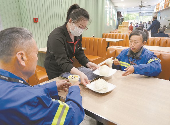 清晨,环卫工师傅在饭堂吃早饭