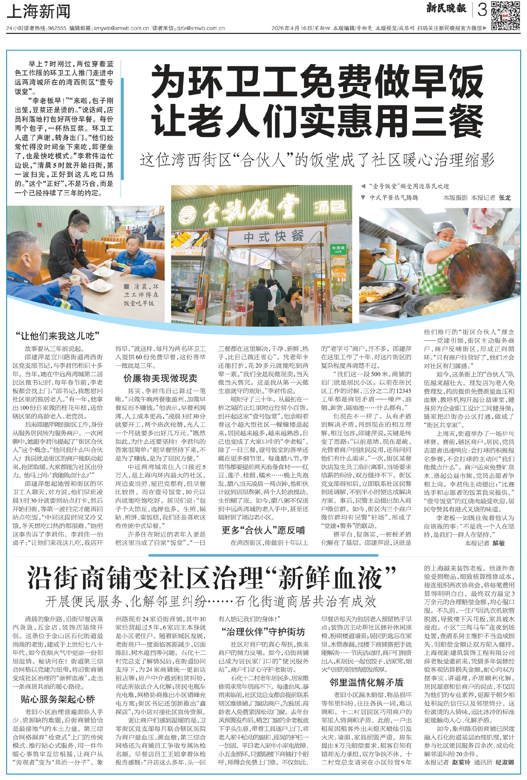 邵建萍想起她曾和街区的环卫工人聊天,对方说,他们早班凌晨3时30分就要到站点打卡,然后开始扫街,等第一波扫完才能再回站点吃饭。“中间这段时间又冷又饿,冬天想吃口热的都很难。”她把这事告诉了李君伟。李君伟一拍桌子:“让他们来我这儿吃,我店开得早。”就这样,每月为两名环卫工人提供60份免费早餐,这份善举一做就是三年。