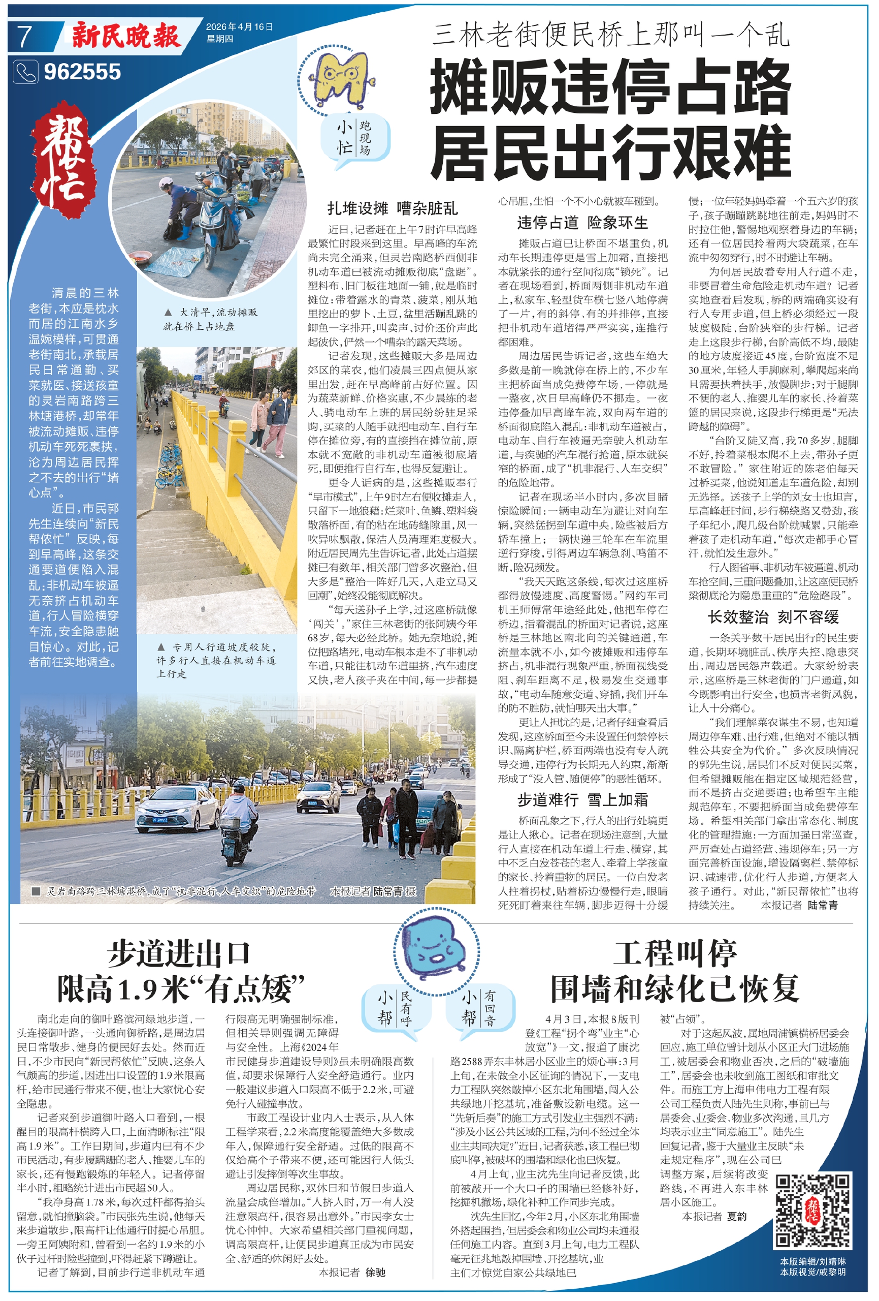 “我们理解菜农谋生不易,也知道周边停车难、出行难,但绝对不能以牺牲公共安全为代价。”多次反映情况的郭先生说,居民们不反对便民买菜,但希望摊贩能在指定区域规范经营,而不是挤占交通要道;也希望车主能规范停车,不要把桥面当成免费停车场。希望相关部门拿出常态化、制度化的管理措施:一方面加强日常巡查,严厉查处占道经营、违规停车;另一方面完善桥面设施,增设隔离栏、禁停标识、减速带,优化行人步道,方便老人孩子通行。对此,“新民帮侬忙”也将持续关注。