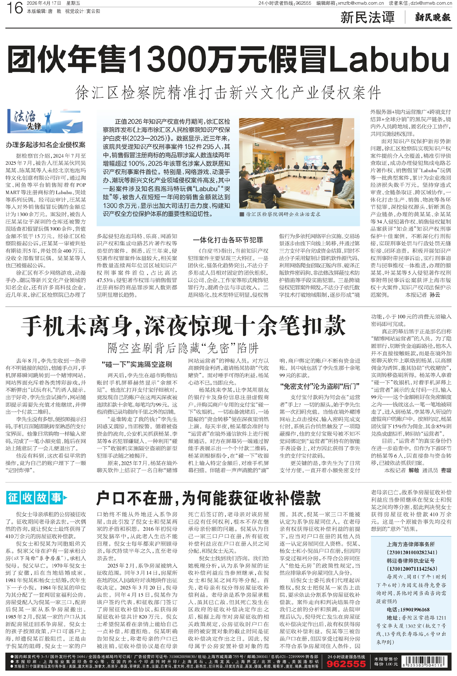 面对知识产权保护新形势新问题,徐汇区检察院实现知识产权案件提前介入全覆盖,精准引导侦查取证,成功办理侵犯集成电路芯片著作权、销售假冒“Labubu”玩偶等一批典型案件,累计为企业挽回经济损失数千万元。坚持穿透式审查、全链条取证、跨区域协作,一体化打击生产、销售、物流等各环节犯罪,深挖侵权源头、斩断黑色产业链条,办理的黄某某、余某某等34人侵犯著作权、销售侵权复制品案获评“知企通”知识产权刑事保护十佳案例。不断深化行刑衔接,实现刑事处罚与行政处罚无缝衔接、闭环追责。积极开展知识产权刑事附带民事诉讼,实行刑事追责与民事维权一体推进,办理的颜某某、叶某某等5人侵犯著作权刑事附带民事诉讼案获评上海市版权十大案件、知识产权司法保护示范案例。 本报记者 孙云