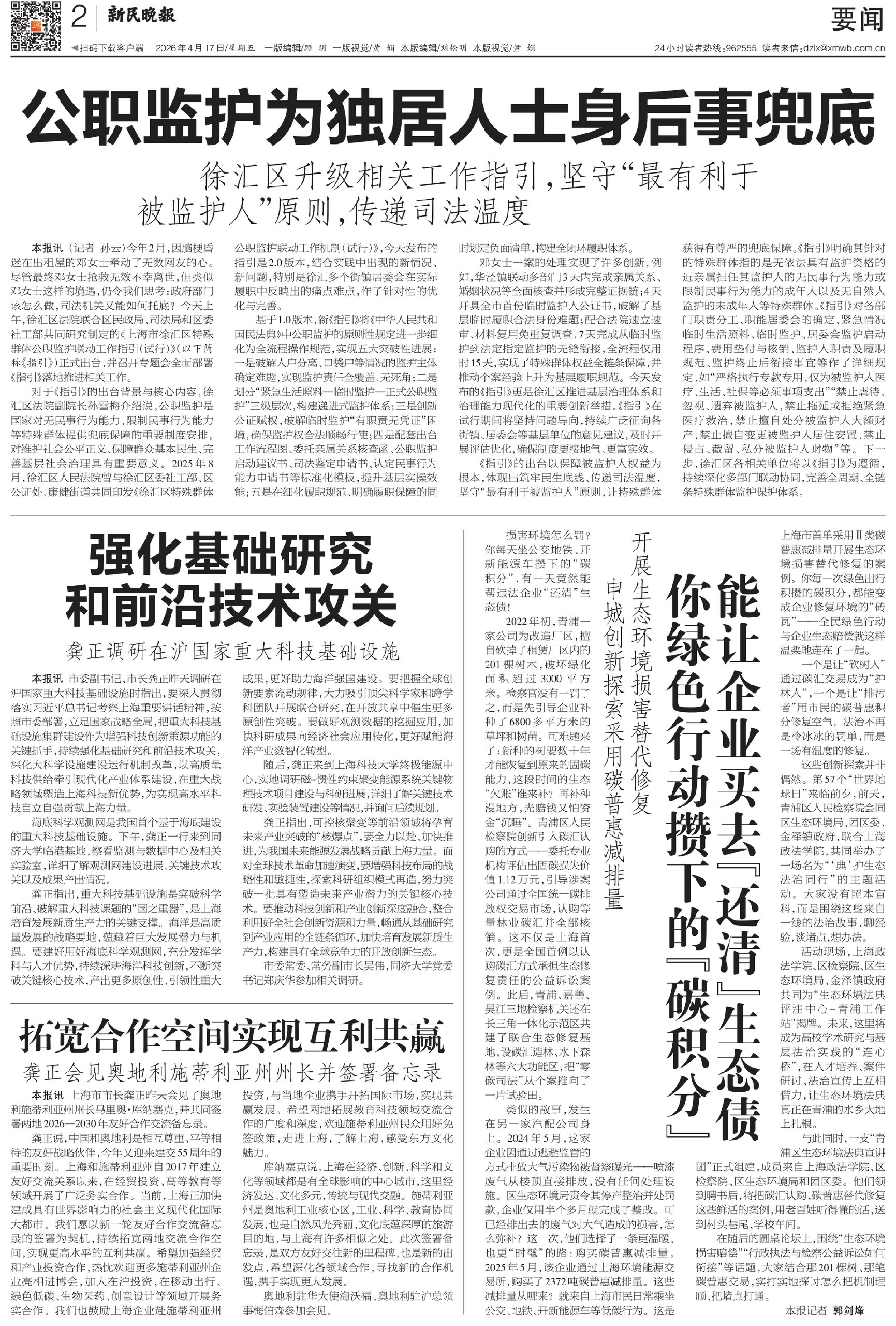 邓女士一案的处理实现了许多创新,例如,华泾镇联动多部门3天内完成亲属关系、婚姻状况等全面核查并形成完整证据链;4天开具全市首份临时监护人公证书,破解了基层临时履职合法身份难题;配合法院速立速审、材料复用免重复调查,7天完成从临时监护到法定指定监护的无缝衔接,全流程仅用时15天,实现了特殊群体权益全链条保障,并推动个案经验上升为基层履职规范。今天发布的《指引》更是徐汇区推进基层治理体系和治理能力现代化的重要创新举措。《指引》在试行期间将坚持问题导向,持续广泛征询各街镇、居委会等基层单位的意见建议,及时开展评估优化,确保制度更接地气、更富实效。