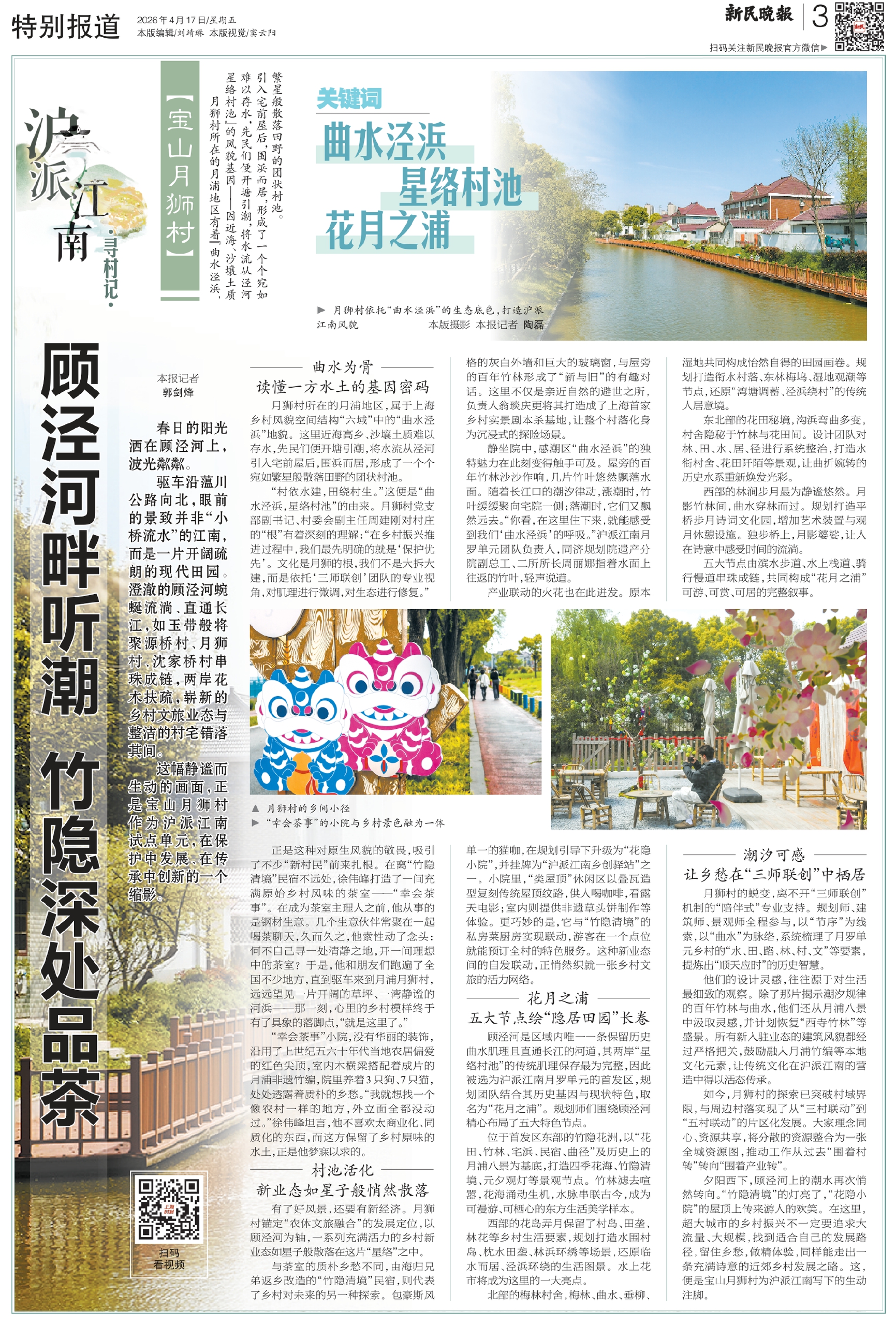 夕阳西下,顾泾河上的潮水再次悄然转向。“竹隐清境”的灯亮了,“花隐小院”的屋顶上传来游人的欢笑。在这里,超大城市的乡村振兴不一定要追求大流量、大规模,找到适合自己的发展路径,留住乡愁,做精体验,同样能走出一条充满诗意的近郊乡村发展之路。这,便是宝山月狮村为沪派江南写下的生动注脚。