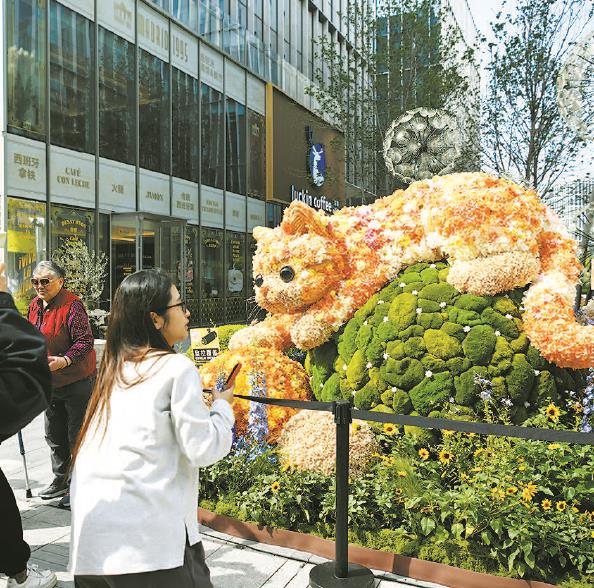 橘猫造型的鲜花艺术装置成为最热门打卡点之一 本报记者 徐程 摄