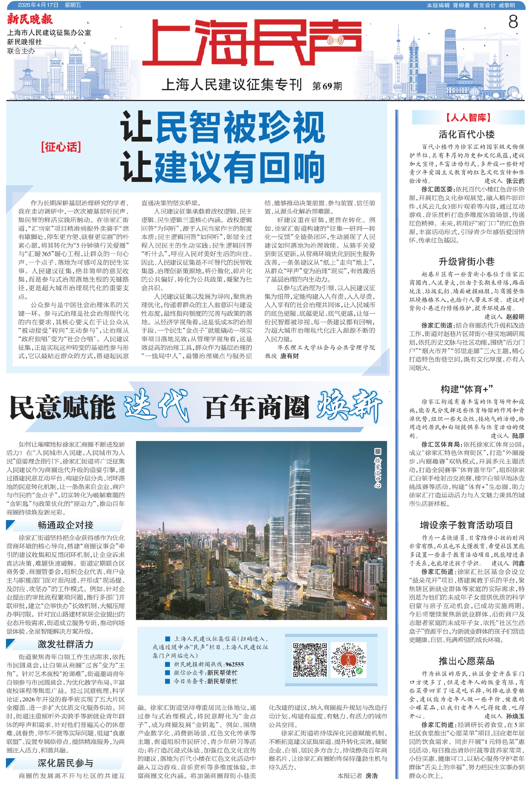 作为长期深耕基层治理研究的学者,我在走访调研中,一次次被基层听民声、集民智的鲜活实践所触动。在徐家汇街道,“汇当家”项目精准捕捉外卖骑手“想有歇脚处、停车更方便、就餐更实惠”的朴素心愿,将其转化为“5分钟骑行关爱圈”与“汇暖365”暖心工程,让群众的一句心声、一个点子,落地为可感可及的民生实事。人民建议征集,绝非简单的意见收集,而是参与式治理落地生根的关键路径,更是超大城市治理现代化的重要支点。