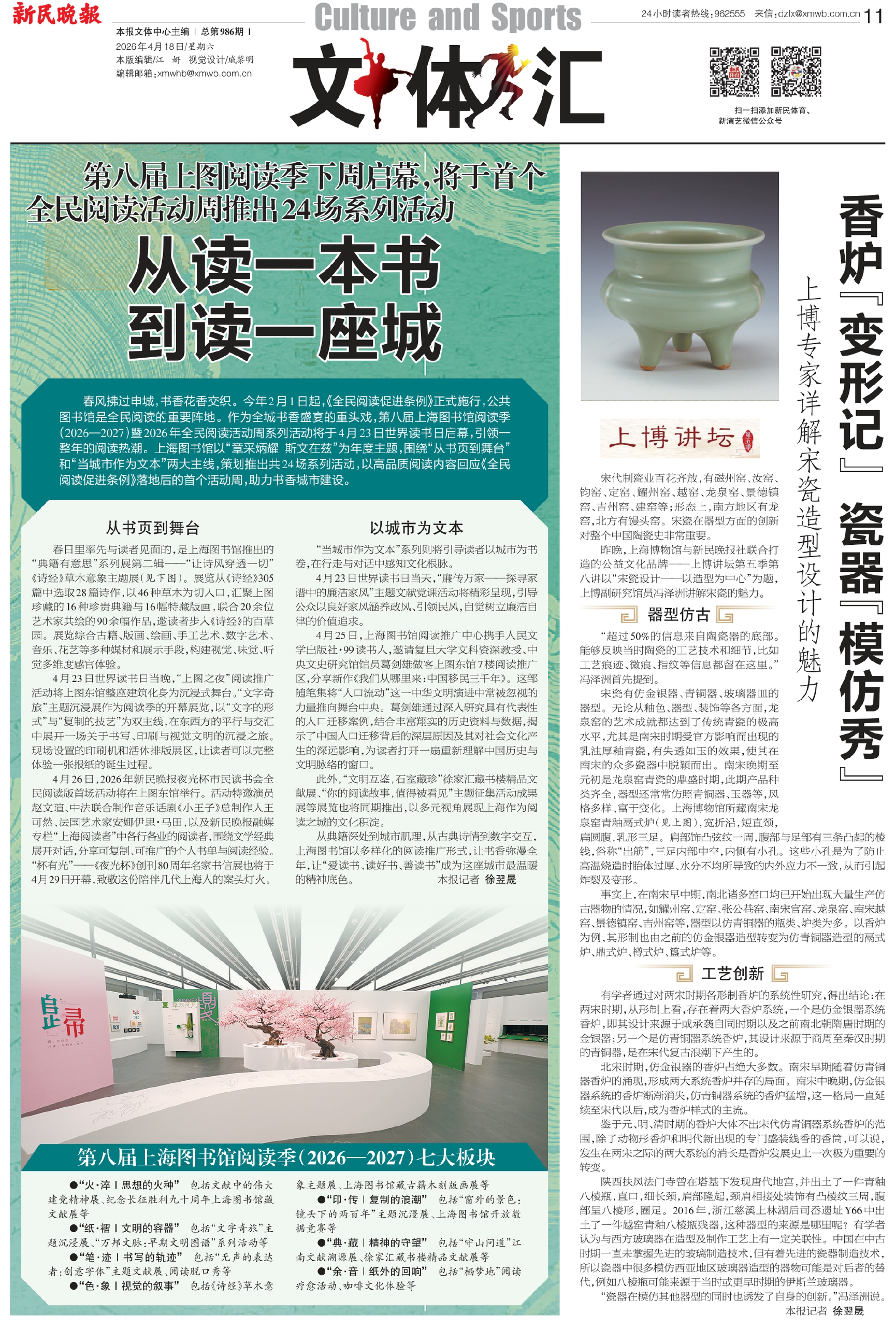 春风拂过申城,书香花香交织。今年2月1日起,《全民阅读促进条例》正式施行,公共图书馆是全民阅读的重要阵地。作为全城书香盛宴的重头戏,第八届上海图书馆阅读季(2026—2027)暨2026年全民阅读活动周系列活动将于4月23日世界读书日启幕,引领一整年的阅读热潮。上海图书馆以“章采炳耀 斯文在兹”为年度主题,围绕“从书页到舞台”和“当城市作为文本”两大主线,策划推出共24场系列活动,以高品质阅读内容回应《全民阅读促进条例》落地后的首个活动周,助力书香城市建设。