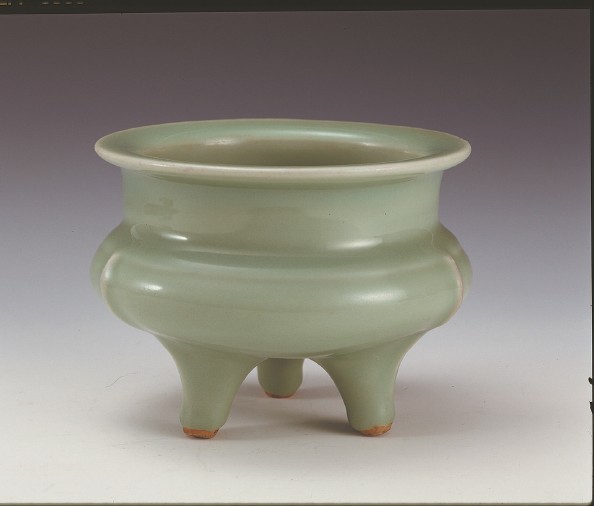 宋瓷有仿金银器、青铜器、玻璃器皿的器型。无论从釉色、器型、装饰等各方面,龙泉窑的艺术成就都达到了传统青瓷的极高水平,尤其是南宋时期受官方影响而出现的乳浊厚釉青瓷,有失透如玉的效果,使其在南宋的众多瓷器中脱颖而出。南宋晚期至元初是龙泉窑青瓷的鼎盛时期,此期产品种类齐全,器型还常常仿照青铜器、玉器等,风格多样、富于变化。上海博物馆所藏南宋龙泉窑青釉鬲式炉(见上图),宽折沿,短直颈,扁圆腹,乳形三足。肩部饰凸弦纹一周,腹部与足部有三条凸起的棱线,俗称“出筋”,三足内部中空,内侧有小孔。这些小孔是为了防止高温烧造时胎体过厚、水分不均所导致的内外应力不一致,从而引起炸裂及变形。