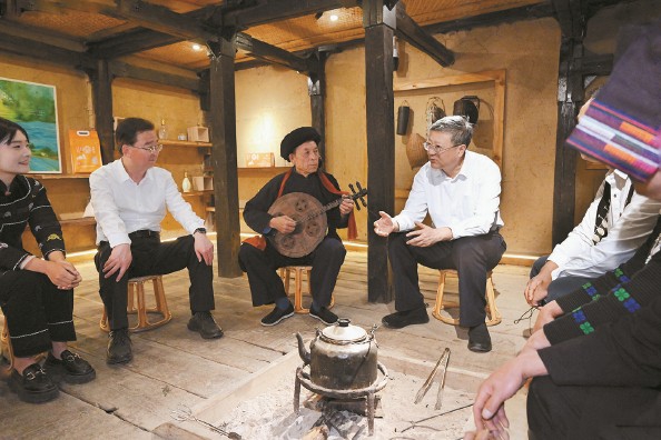 4月16日至17日,陈吉宁率上海市代表团赴云南省学习考察。这是17日陈吉宁与王宁一同来到红河州元阳县新街镇阿者科村,同哈尼古歌非遗传承人马建昌等村民代表亲切交流 本报记者 陈正宝 摄