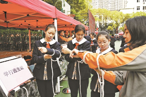 学生在学习打逃生结 本报记者 陶磊 摄