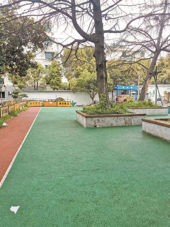 新泾苑是一个房龄已超过25年的老小区,共有80多幢楼,居民上千户,物业费0.8元/平方米。记者在该小区看到,小区楼栋整体外观较为老旧,门洞铁门已经锈迹斑斑,门上安装着名为“阿瑞斯智能”的门禁系统,原本是刷卡才能开门,但记者随手一拉就开了门,还有些门禁按键已经失灵,也没人修理,铁门索性就开着。小区的中心广场,面积有数百平方米,铺了一层绿色和棕红色的橡胶地垫,地垫部分已经起皮,保养状况并不是很好。广场上的几棵大树被隔离保护起来。在广场旁边,则是健身区域,分布着一些健身器材。