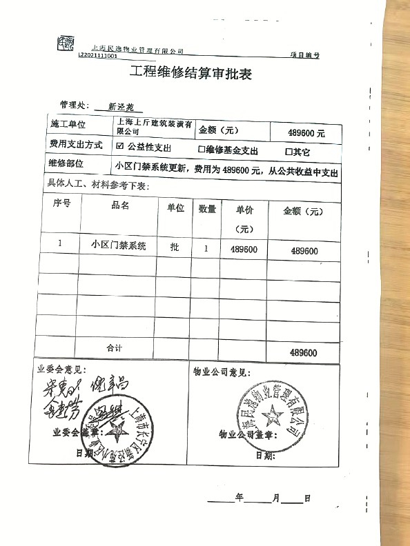 “两项改造的施工方都是同一家公司,而且项目根本就没有公开招标,也没有进行三方比价。”居民们告诉记者,他们查询发现,施工单位“上斤建筑”公司成立日期是在2022年底,差不多刚一成立就接了小区两个总价上百万元的工程,甚至小区智能门禁的实际安装时间还在该公司成立日期之前,认为工程存在“内定”的情况。更加可疑的是,在物业及业委会提供的相关项目合同和工程结算审批表等文件中,虽然有物业和业委会的签名盖章,但均没有填写具体的日期。