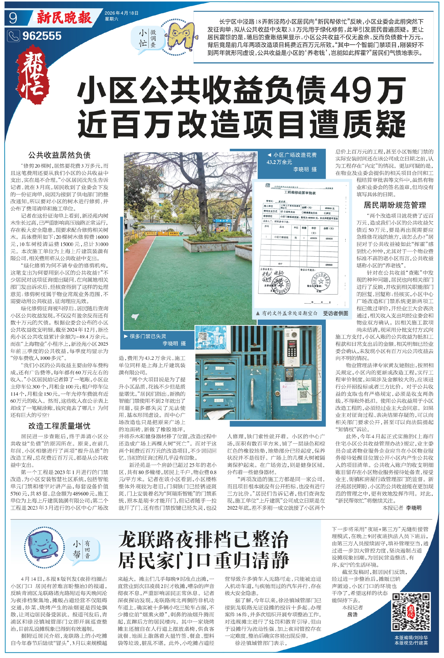 此外,今年4月起正式实施的《上海市住宅小区公共收益管理办法》规定,业主委员会或者物业服务企业应当在小区物业服务接待处醒目位置公开小区内产生公共收入的项目清单。公共收入账户的收支明细账目留存在小区物业服务接待处备查,接受业主、街镇和房屋行政管理部门的监督。新泾苑居民期盼,小区的公共收益能在更加规范的管理之中,更有效地发挥作用。对此,“新民帮侬忙”将继续关注。