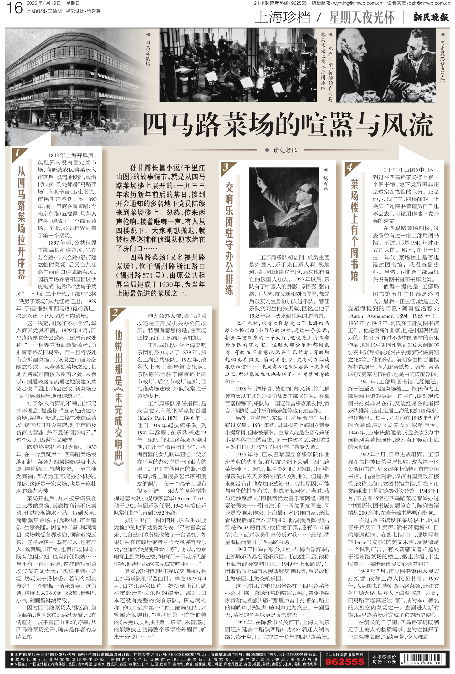 工部局乐队(今上海交响乐团前身)成立于1879年,原名上海公共乐队。1922年,改名为上海工部局管弦乐队。乐队原先常驻于南京路上的市政厅,后来市政厅被拆、四马路菜场建成,乐队就常驻于菜场楼上。