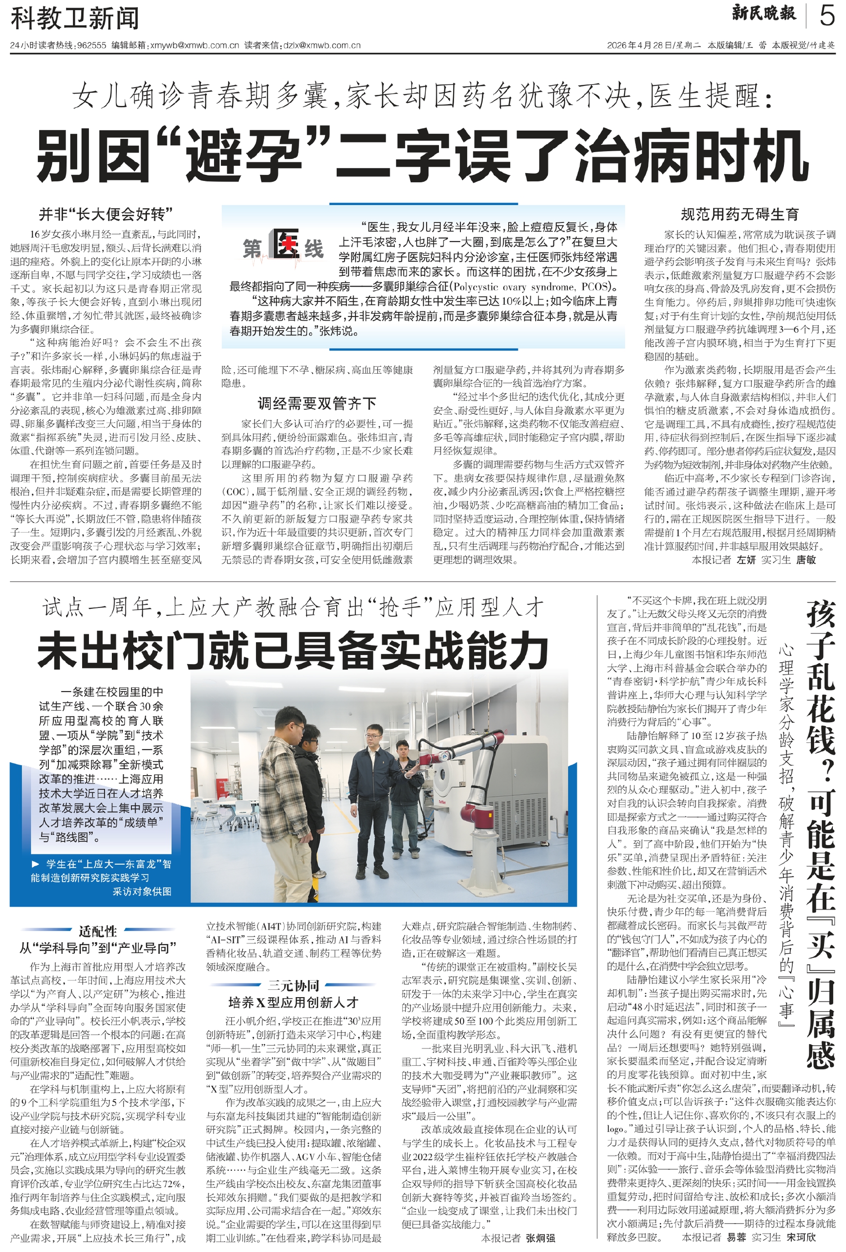 “医生,我女儿月经半年没来,脸上痘痘反复长,身体上汗毛浓密,人也胖了一大圈,到底是怎么了?”在复旦大学附属红房子医院妇科内分泌诊室,主任医师张炜经常遇到带着焦虑而来的家长。而这样的困扰,在不少女孩身上最终都指向了同一种疾病——多囊卵巢综合征(Polycystic ovary syndrome,PCOS)。