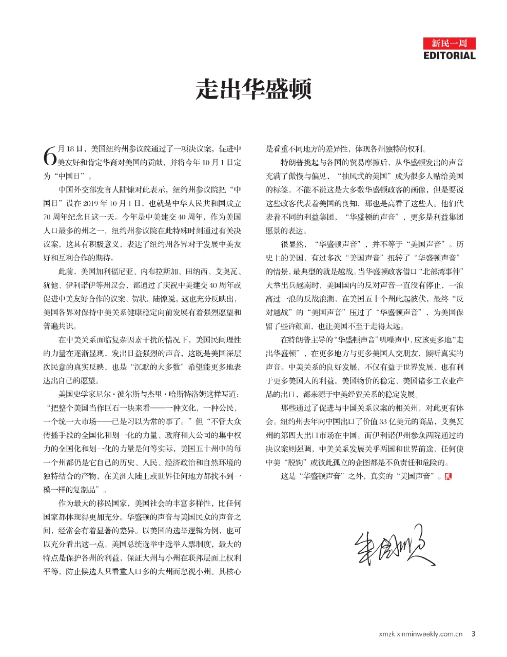 在特朗普主导的“华盛顿声音”叽噪声中,应该更多地“走出华盛顿”,在更多地方与更多美国人交朋友,倾听真实的声音。中美关系的良好发展,不仅有益于世界发展,也有利于更多美国人的利益。美国物价的稳定、美国诸多工农业产品的出口,都来源于中美经贸关系的稳定发展。