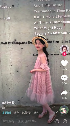 “最美童模”裴佳欣通过抖音走红,目前已经收获了149万微博粉丝,并出现在TFBOYS的MV中。