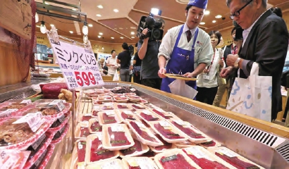 日本重启商业捕鲸招致了国际社会的大量批评声。近日,日本阪急百货店梅田总店在鲜鱼卖场销售日本重启商业捕鲸后首次进货的鲸肉,同时还举行限定数量的品尝活动。