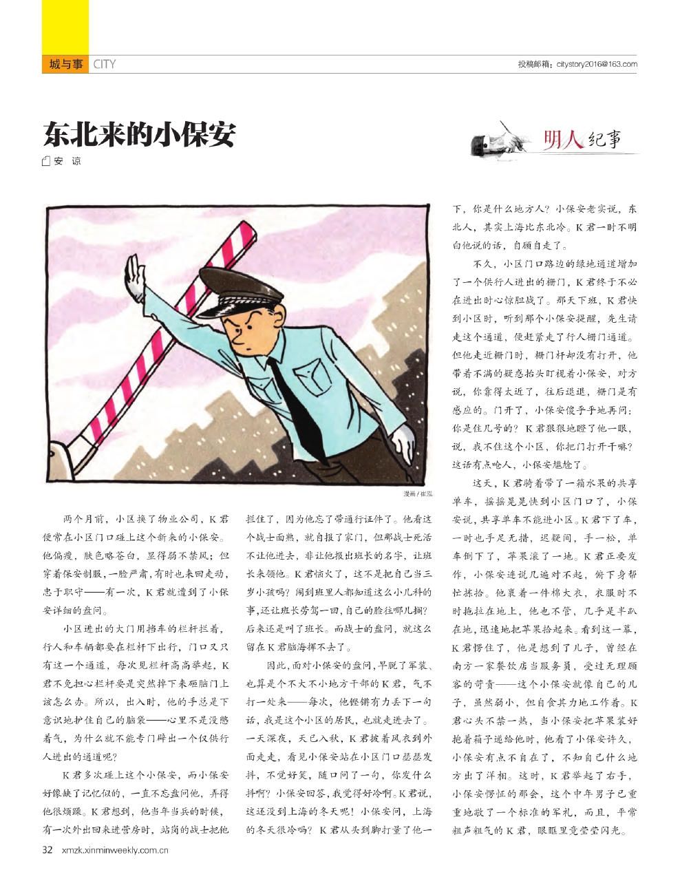 两个月前,小区换了物业公司,K君便常在小区门口碰上这个新来的小保安。他偏瘦,肤色略苍白,显得弱不禁风;但穿着保安制服,一脸严肃,有时也来回走动,忠于职守——有一次,K君就遭到了小保安详细的盘问。