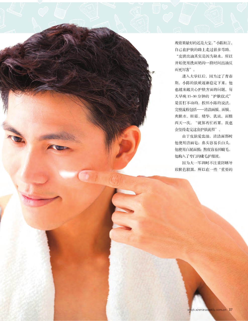 黄嘉承认,最早开始护肤是电视上那些“肤白貌美”的小男生给了他“刺激”。“男人为什么一定要糙?”在黄嘉看来,男人把自己打扮一下,既是对别人的尊重,也是对自己负责。
