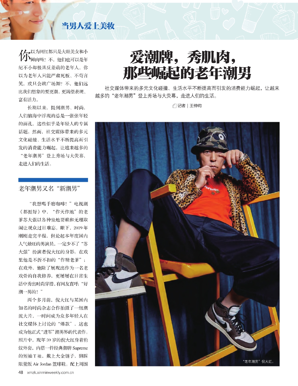 两个多月前,倪大红与某国内知名的时尚杂志合作拍摄了一组潮流大片,一时间成为众多年轻人在社交媒体上讨论的“爆款”,这也成为他正式“进军”潮男界的代表作。照片中,现年59岁的倪大红身着豹纹外套,内搭一件经典潮牌Supreme的短袖T裇,戴上大金链子,脚踩限量版Air Jordan篮球鞋。配上周围的深色幕布,穿戴鲜艳的倪大红以一种演技之外的方式给人以强烈的视觉冲击。