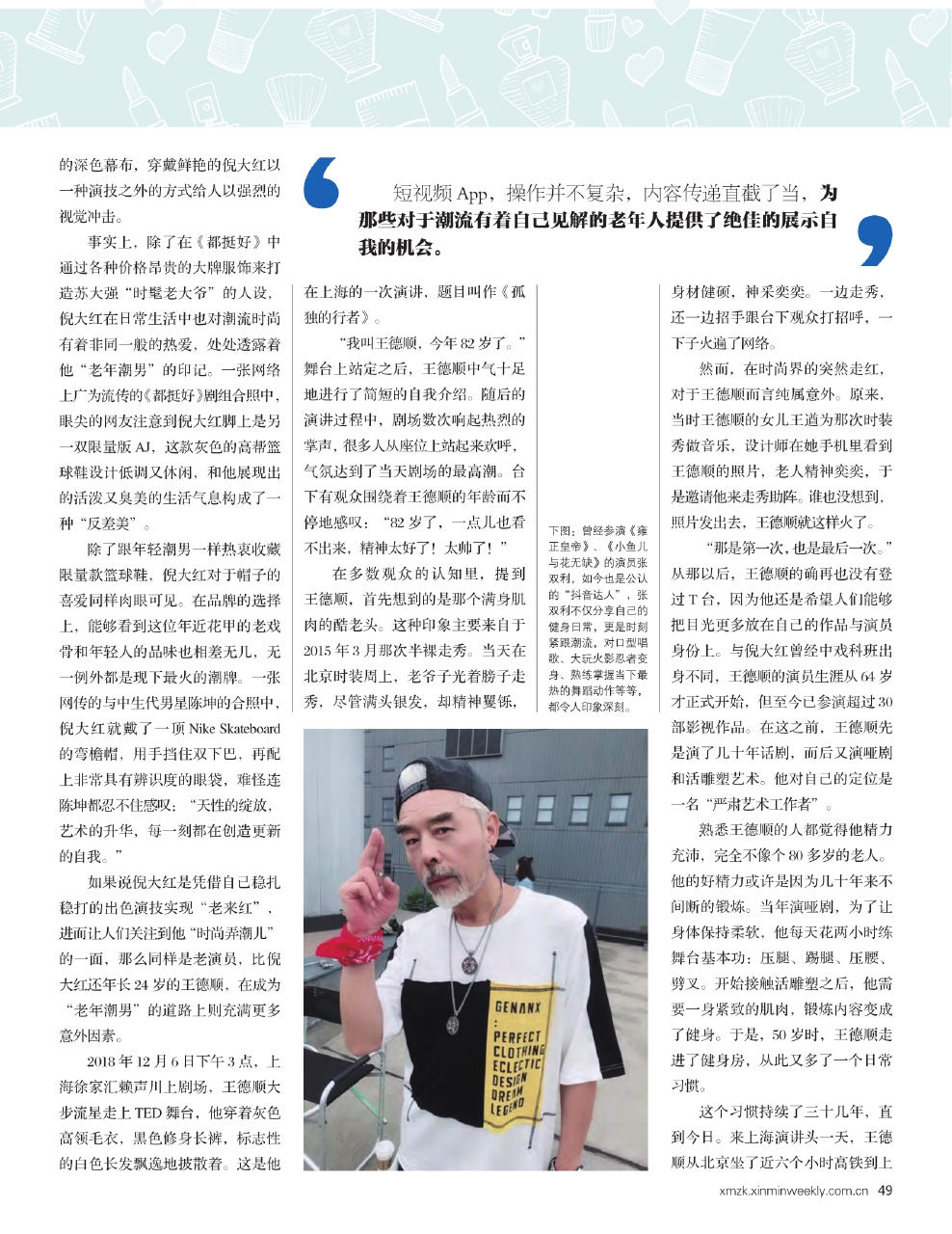 从年龄上看,倪大红是不折不扣的老戏骨,而王德顺更是年逾耄耋,白发苍苍。但是,身体、精神面貌与年龄的反差,成为他们身上最显著的标识。这些“老年潮男”,正在用自己的方式重新定义一种不