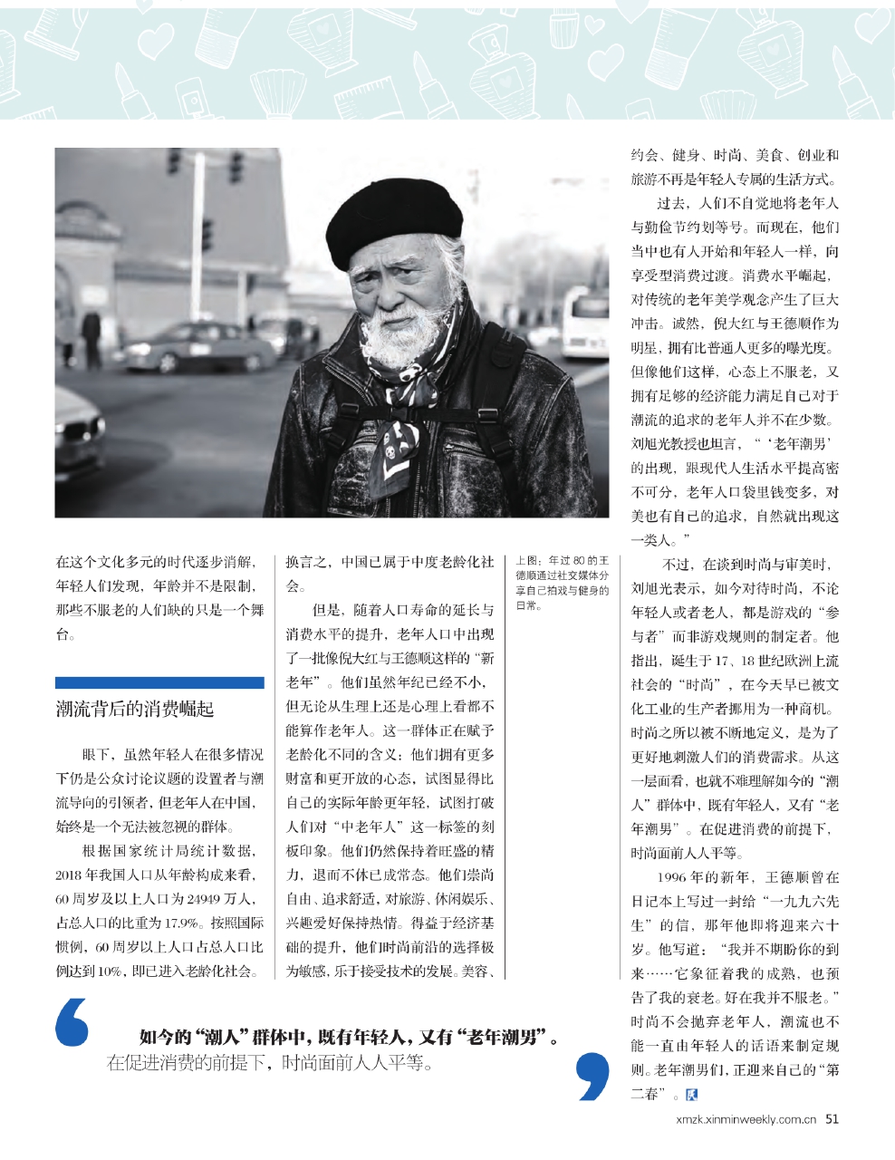 但是,随着人口寿命的延长与消费水平的提升,老年人口中出现了一批像倪大红与王德顺这样的“新老年”。他们虽然年纪已经不小,但无论从生理上还是心理上看都不能算作老年人。这一群体正在赋予老龄化不同的含义:他们拥有更多财富和更开放的心态,试图显得比自己的实际年龄更年轻,试图打破人们对“中老年人”这一标签的刻板印象。他们仍然保持着旺盛的精力,退而不休已成常态。他们崇尚自由、追求舒适,对旅游、休闲娱乐、兴趣爱好保持热情。得益于经济基础的提升,他们时尚前沿的选择极为敏感,乐于接受技术的发展。美容、约会、健身、时尚、美食、创业和旅游不再是年轻人专属的生活方式。