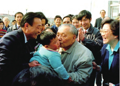 1992年2月12日,邓小平同志南巡来到上海闵行区旗忠村视察时亲吻农家儿。 张蔚飞摄影